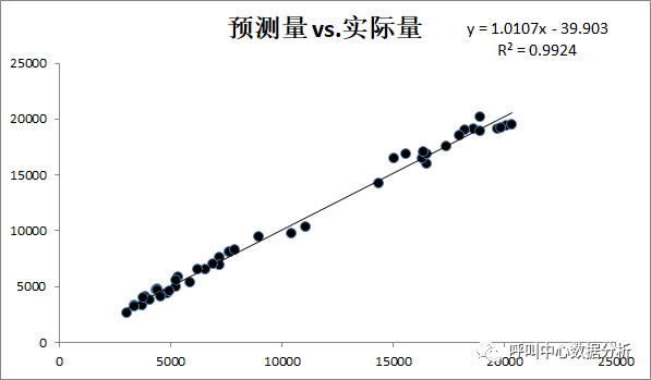 第一种方式是测算预测量与实际量两者之间的相关系数与线性关系。相关系数越高,越趋向于+1,说明预测准确度越高,越低则越需要改进。假设我们有如下的48个时段的预测数据与实际发生数据,我们只需用CORREL函数把两列数据带入求相关系数就可以了。相关系数的结果范围在-1到+1之间,0-1之间是正相关,0到-1之间是负相关,当然如果你的工作量预测与实际呈现负相关,就可以好好面壁去了。我们还可以直接用这两列数据生成散点图并拟合趋势线,以直观的方式查看两者之间的线性趋势以及R方值也是可以的。但是,这种预测方法只能反应整体的准确度情况,不能很好地反应具体时段的情况。而业务量预测应该追求的是每一个时段的预测都误差最小化。