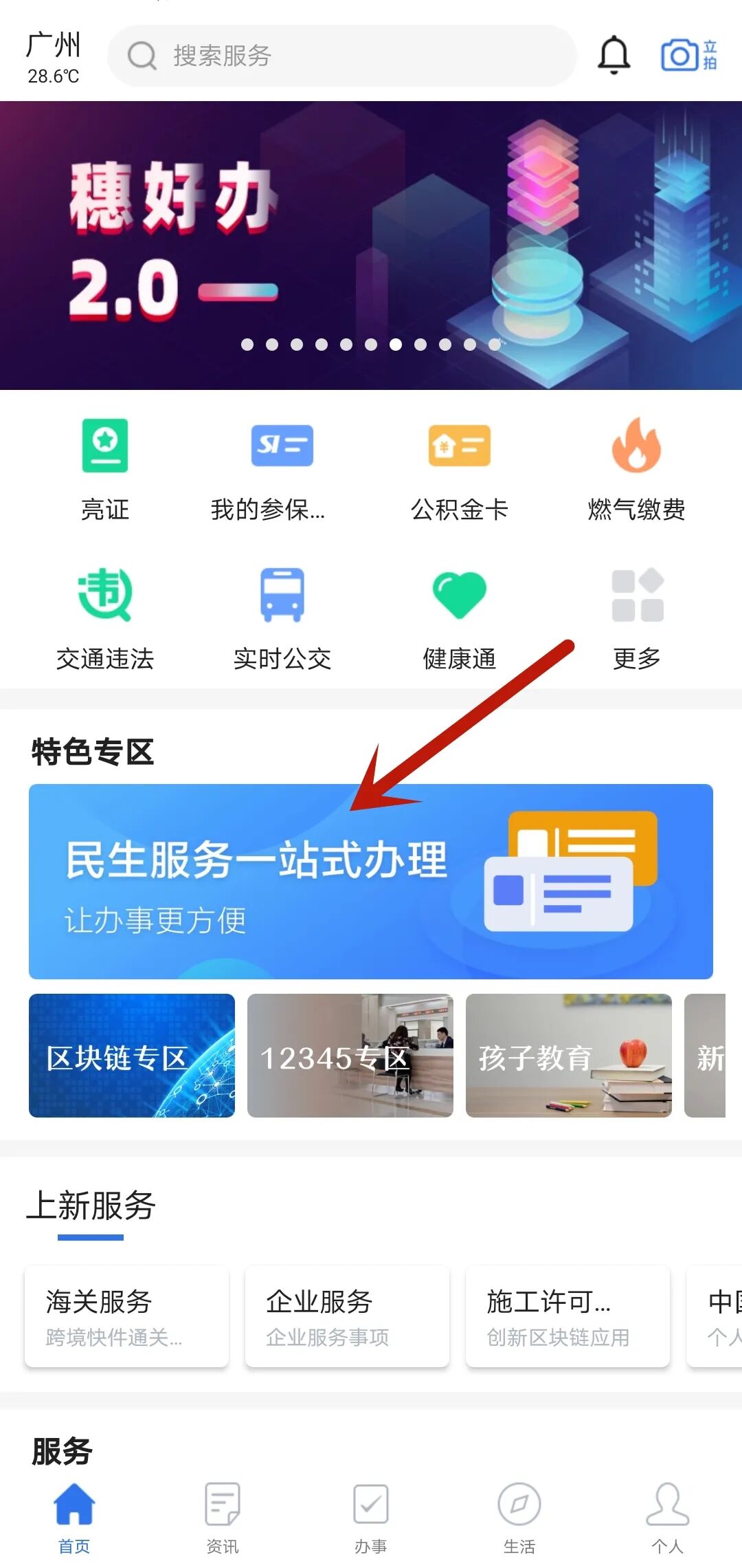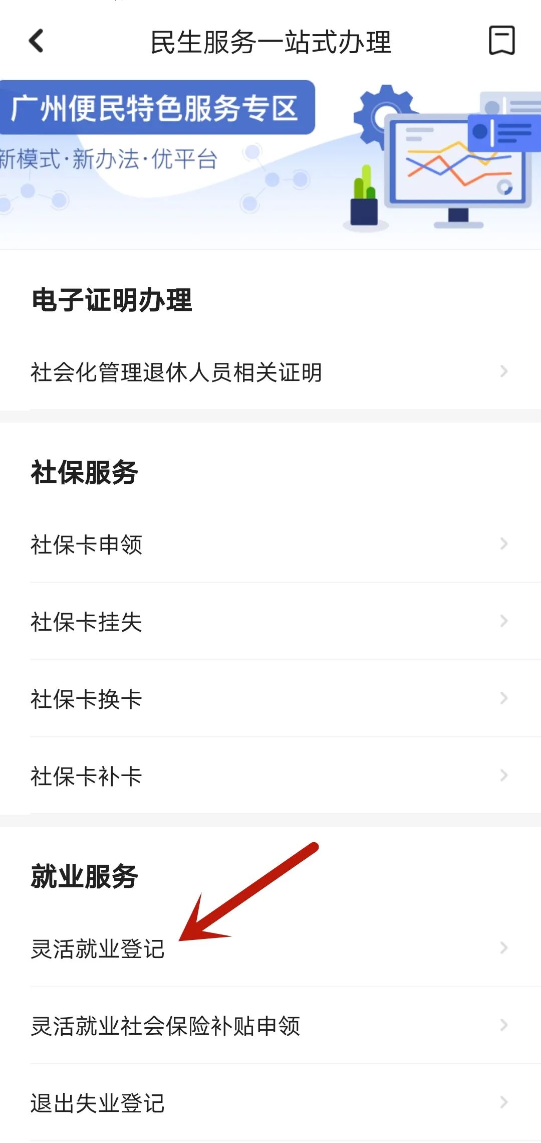 1、下载登录“穗好办”,首页“民生服务一站式办理”→选择“灵活就业登记”